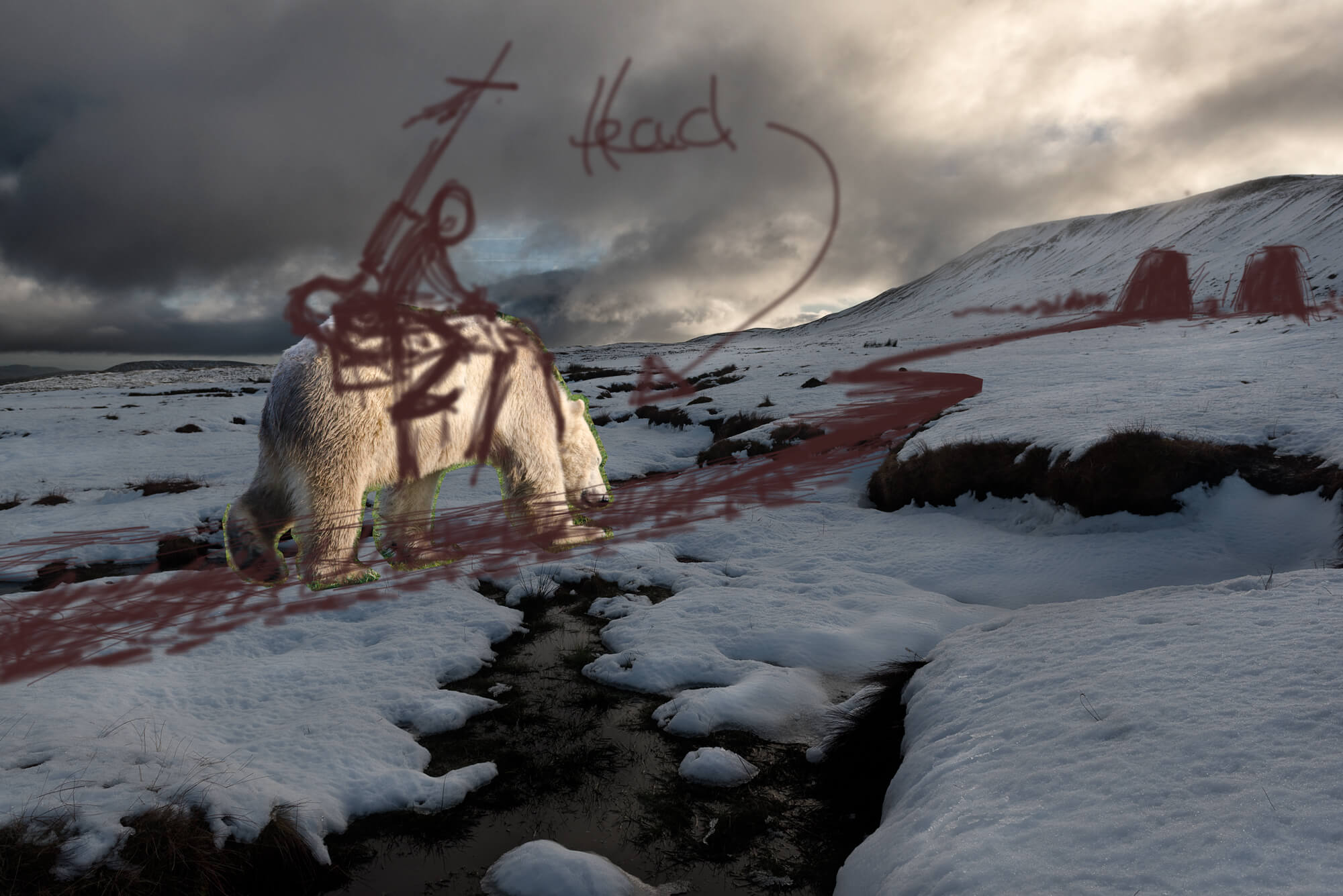 The background was shot up in the Yorkshire Dales on the approach to Whernside in the snow. A few days after headed over to the Yorkshire Wildlife Park at Doncaster to get the Polar Bear shot I needed, then roughly put those images together in photoshop then drew over it as a proof of concept to see if it would work.
